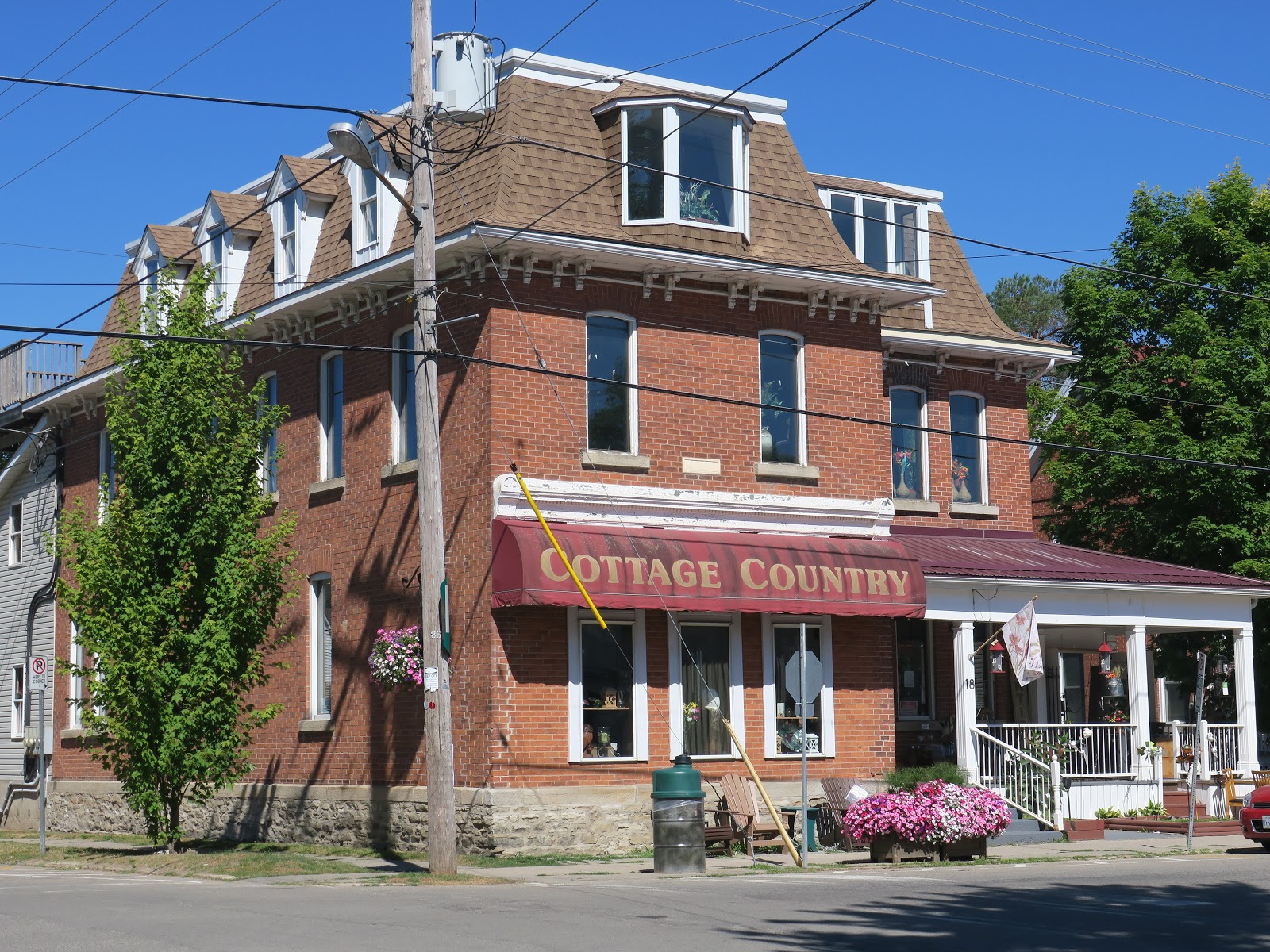 Now it's getting exciting. Behind 51 Main Street, at the corner of Rideau street, behind an iconic summer home we catch a glimpse of Rideau Lake. Some Queen Anne details of the dwelling have survived the application of white vinyl, offset by crisp black paint.